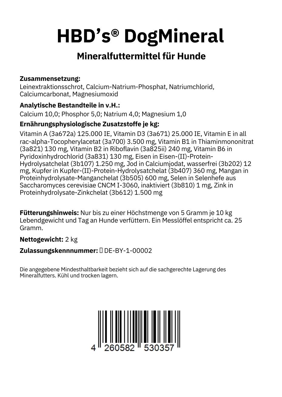 Verleihen Sie der täglichen Futterration Ihres Hundes mit HBD’s® DogMineral eine Extraportion Mineralstoffe! Unser Mineralfutter für Hunde eignet sich ideal zur Ergänzung der häufig unausgewogenen Mineralisierung in handelsüblichen Hundefuttern. Die in HBD’s® DogMineral enthaltenen organisch gebundenen Spurenelemente haben eine hohe Bioverfügbarkeit. Zudem eignet sich HBD’s® DogMineral hervorragend als BARF-Zusatz.