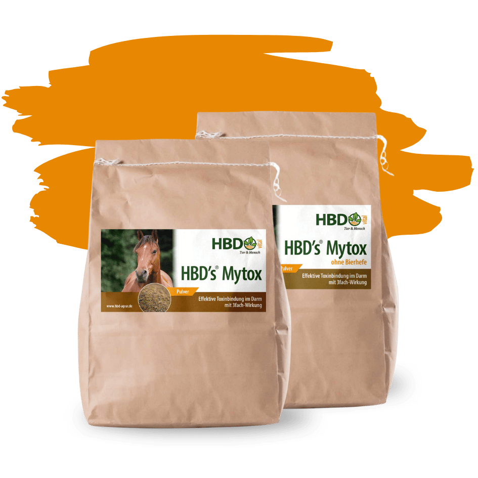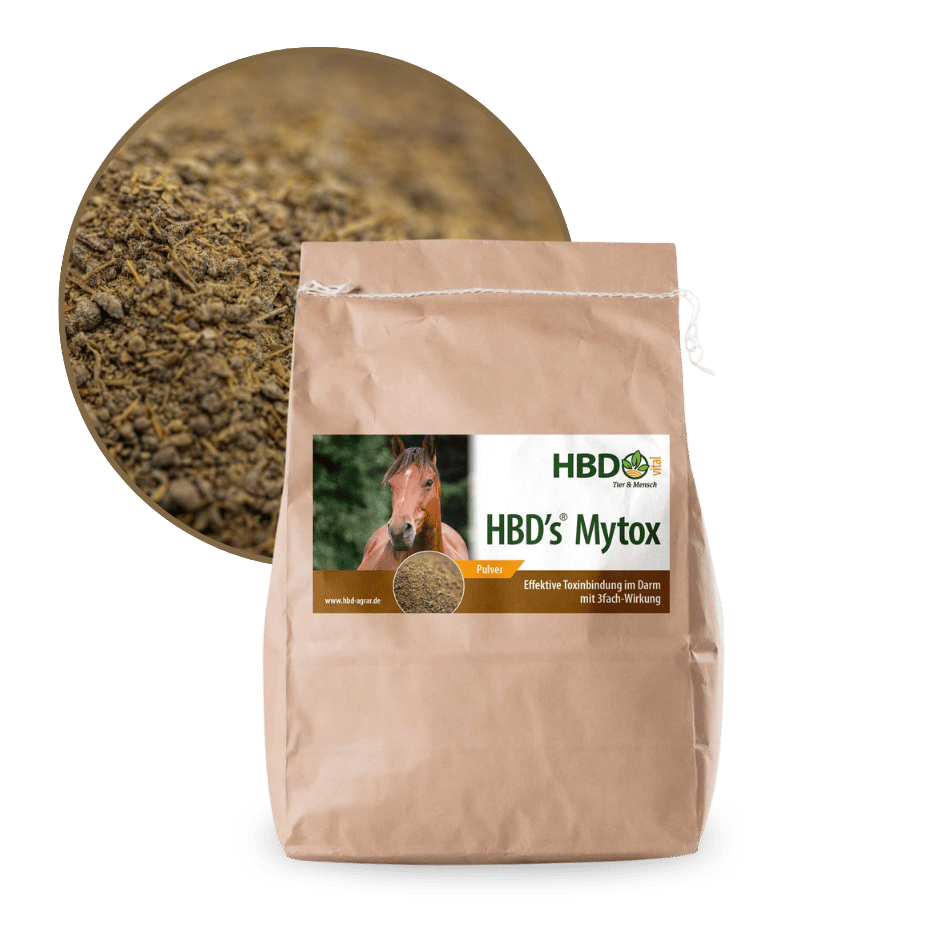 HBD’s® Mytox – Der umfassende Toxinbinder für Pferde HBD’s® Mytox ist ein effektives Ergänzungsfuttermittel für Pferde, das aus hochwertigen Wirkstoffen besteht und Giftstoffe, Pilzgifte sowie Giftstoffe, die im Rahmen von Wurmkuren anfallen, im Darm Ihres Pferdes bindet. Diese Giftstoffe werden anschließend ausgeschieden, bevor sie die Darmschleimhäute reizen und Entzündungen verursachen können. Dadurch bleibt der Organismus Ihres Pferdes entlastet und die allgemeine Gesundheit wird gefördert. Ein herausragendes Merkmal von HBD’s® Mytox ist, dass die Nährstoffaufnahme und -verwertung Ihres Pferdes nicht beeinträchtigt wird. Dieser Toxinbinder unterstützt die Darmgesundheit und trägt somit zu einem besseren Wohlbefinden Ihres Pferdes bei. Zusätzlich ist HBD’s® Mytox: Getreidefrei Frei von Zurckerzusätzen Frei von Kräutern Frei von Synthetika Was ist das Besondere an HBD’s® Mytox für Pferde? Dieser Toxinbinder für Pferde, der aus natürliche Tonmineralien (Betonite) und Hefeextrakte mit hohen Anteilen an Glukanen besteht, besitzt starke toxinbindende Eigenschaften und kann bis zu 85 % der relevanten Mykotoxine im Pferdedarm binden und unschädlich machen. Wir haben uns bewusst für hochwertige Bierhefe als Trägerstoff in HBD’s® Mytox entschieden, um die Darmgesundheit Ihres Pferdes zu unterstützen. Vorteile der hochwertigen Bierhefe in HBD’s® Mytox: Unterstützt die Darmgesundheit: Bierhefe als Trägerstoff fördert die Darmgesundheit und vermeidet Probleme durch andere Trägerstoffe wie Getreide oder Zucker. Reich an Vitamin-B-Komplex: Die in HBD’s Mytox enthaltene, hochwertige Bierhefe ist reich an bioverfügbarem Vitamin-B-Komplex, der besonders wichtig für Pferde mit Darmproblemen ist, da deren Eigenproduktion durch ein geschädigtes Darmmikrobiom eingeschränkt sein kann. HBD’s® Mytox bietet schnelle und effektive Unterstützung für Pferde, die unter den Auswirkungen von Mykotoxinen leiden. Zwar kann HBD’s® Mytox die Ursache der Giftstoffe nicht beseitigen, aber es liefert rasche Linderung bei ausgeprägten Problemen und trägt wesentlich zur Verbesserung der Darmgesundheit bei. Es kann auch im Rahmen einer ursächlichen Darmsanierung begleitend eingesetzt werden. Geben Sie Ihrem Pferd die beste Unterstützung mit HBD’s® Mytox. Profitieren Sie von den natürlichen Inhaltsstoffe, die bis zu 85% der Mykotoxine binden können. Probieren Sie es aus! Einsatzgebiete von HBD’s® Mytox für Pferde: Verdauung, Stoffwechsel & Immunsystem: Für Pferde mit Durchfall und Kotwasser Für Pferde mit chronischen oder akuten Leberproblemen Für Pferde mit Störung oder Schwächung des Immunsystems Einsatz im Rahmen einer Entgiftungstherapie, um eine zusätzliche Verteilung von Toxinen aus dem Darm in den Körper Ihres Pferdes zu verhindern Bei Pferden mit einer Fehlbesiedelung im Darm, die Giftstoffe (Enterotoxine) produziert, also das Pferd vom Darm ausgehend mit Giftstoffen überschwemmt Bei einer Fehlbesiedelung der Darmflora, die bei Pferden zu einer schlechteren Verdauung des Futters führt und dadurch zu Fehlgärungen oder Fäulnisprozessen im Darm Bei schlechten Raufutterqualitäten Atemwegserkrankungen:: Für Pferde mit chronischen Lungenproblemen, insbesondere bei Heuallergikern Notfall- & Sofortmaßnahmen: Für Pferde mit Hufrehe (Futterrehe) als Sofortmaßnahme parallel zur Behandlung durch den Tierarzt Für Pferde mit Hufrehegefahr. Wenn das Pferd zu viel Fruktan oder Getreide aufgenommen hat. Möglichst sofort in doppelter Dosis verabreichen, evtl. kann man so die Hufrehe noch abwenden. Je früher verabreicht, desto besser ist der Schutz vor Hufrehe. Vorbeugende Maßnahmen: Zur Vorbeugung bei gelegentlich schlechten Grundfutterqualitäten Zur Begleitung bei Wurmkuren für empfindliche Pferde oder für Pferde mit Darmproblemen.Wie wird HBD’s® Mytox gefüttert? Dosierung: HBD’s® Mytox® sollte mit 10 g je 100 kg Körpergewicht pro Tag in 2 Portionen verfüttert werden. Besondere Anwendungen:Akute Hufrehe und Hufrehegefahr: Bei akuter Hufrehe oder Hufrehegefahr kann die eingesetzte Menge auch verdoppelt werden.Begleitung bei Wurmkuren: Empfindliche Pferde oder Pferde mit Darmproblemen können auf Wurmkuren mit einem leichten Hufreheschub, einem Allergieschub oder Durchfall reagieren. In diesem Fall ist es sinnvoll, die Wurmkur für 3-4 Tage mit HBD’s® Mytox® zu begleiten, um die Leichengifte der absterbenden Parasiten zu binden. Beginnen Sie 0,5 Tage vor der Wurmkur mit der Gabe von HBD’s® Mytox®. Verabreichen Sie HBD’s® Mytox® für weitere 3 Tage nach der Wurmkur. Aufwandmenge: 10-15 g je 100 kg Körpergewicht, verteilt auf 2 Portionen täglich. Wichtiger Hinweis: Durch den Einsatz von HBD’s® Mytox® wird zwar die Ursache bzw. Quelle der Giftstoffe nicht beseitigt, aber es kann Pferden mit ausgeprägten Problemen schnell geholfen werden und so eine Entlastung des Organismus erzielt werden. Beratung: Lassen Sie sich bitte beraten, wie eine ursächliche Strategie aussehen kann, um das bestehende Problem dauerhaft zu beheben.ADMR-Hinweis:Dieses Produkt ist dopingfrei! Gut zu wissen! – weitere Informationen Aufgrund des Klimawandels, sintflutartiger Regen gefolgt von längeren Hitzeperioden speziell im Sommer wird es immer schwieriger, Heu, Stroh und Getreide trocken einzubringen. Somit steigt automatisch der Schimmelpilzgehalt in diesen Futtermitteln und in den Getreidebeständen stetig an. Wenn ein Pferd bereits anderweitig stoffwechselschwach ist oder auch über einen längeren Zeitraum mit solchen Futtermitteln gefüttert wird, kann es zu Überempfindlichkeiten kommen, die sich z.B. als chronische Leberprobleme, als Kotwasserproblematik oder als (allergische) Lungenprobleme äußern können, wobei Letztere meist multifaktorielle Geschehen sind, dem in der Regel mit nur einer Maßnahme nicht beizukommen ist. Anzeichen für schimmelpilzbehaftetes Futter: Unangenehmer, muffiger, saurer und / oder erdiger Geruch des