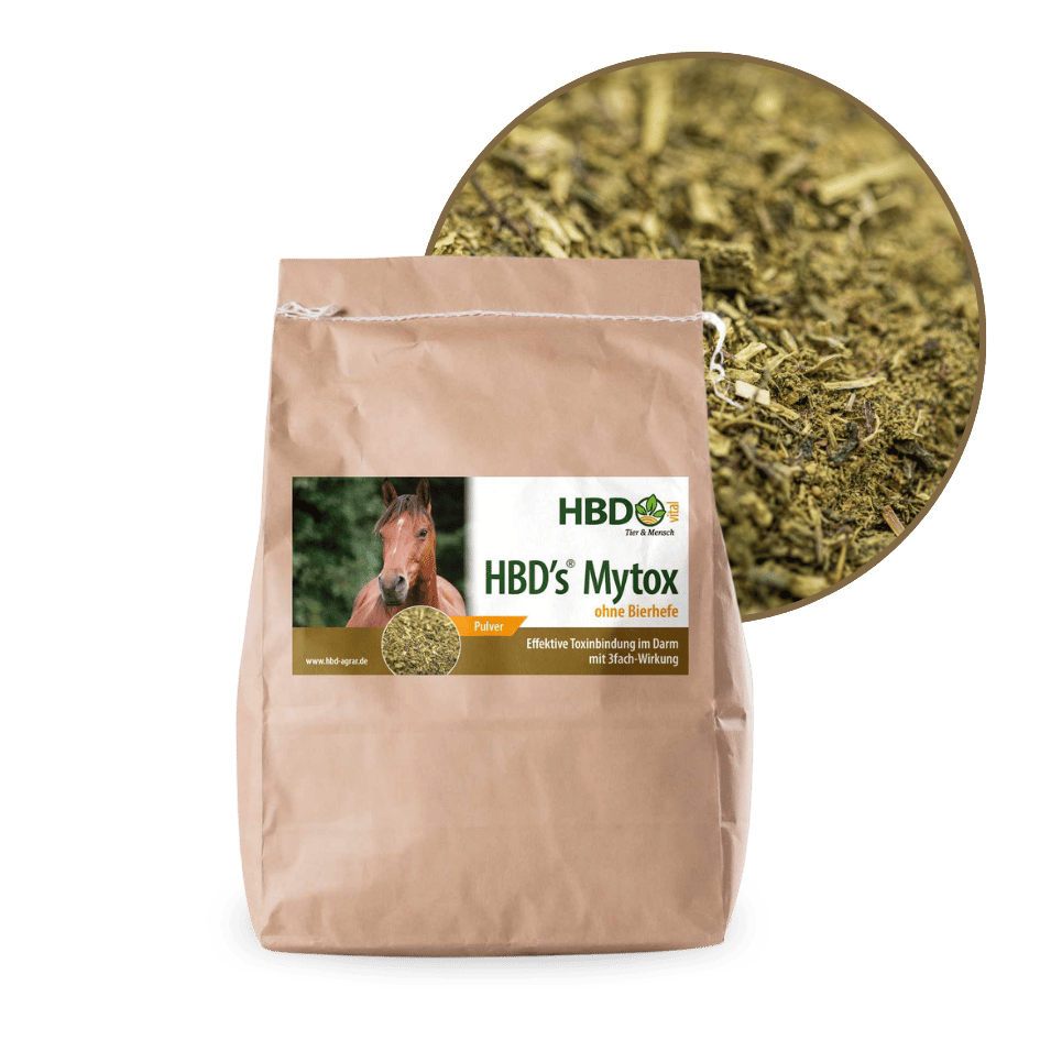 HBD’s® Mytox ohne Bierhefe - Der umfassende Toxinbinder für Pferde HBD’s® Mytox ohne Bierhefe ist ein Ergänzungsfutter für Pferde, das aus hochwertigen Inhaltsstoffen besteht. Dieses Produkt bindet Gifte, Pilzgifte sowie Gifte, die bei Einsatz einer Wurmkur entstehen, im Darm Ihres Pferdes. Es kann verhindern, dass die Darmschleimhäute gereizt und nachfolgend Entzündungen verursacht werden können. Durch die Bindung und anschließende Ausscheidung der Giftstoffe sorgt HBD’s® Mytox ohne Bierhefe dafür, dass der Organismus Ihres Pferdes nicht mit diesen Giftstoffen belastet wird. Ein besonderer Vorteil von HBD’s® Mytox ohne Bierhefe ist, dass die Nährstoffaufnahme und Nährstoffverwertung Ihres Pferdes durch diesen Toxinbinder nicht beeinträchtigt wird. HBD’s® Mytox ohne Bierhefe unterstützt somit die Darmgesundheit Ihres Pferdes und trägt zu einem insgesamt besseren Wohlbefinden bei. Darüber hinaus ist HBD’s® Mytox ohne Bierhefe: Getreidefrei Frei von Zurckerzusätzen Frei von Kräutern Frei von Synthetika Frei von Bierhefe Was ist das Besondere an HBD’s® Mytox ohne Bierhefe für Pferde? HBD’s® Mytox ohne Bierhefe verwendet natürliche Tonmineralien (Betonite) und Hefeextrakte mit hohen Anteilen an Glukanen. Diese Komponenten haben starke toxinbindende sowie die Darmschleimhaut pflegende Eigenschaften und können bis zu 85 % der relevanten Mykotoxine im Pferdedarm binden und unschädlich machen. Für diese bierhefefreie Variante von HBD’s® Mytox haben wir bewusst Grünmehl (aus Gras) als Trägerstoff gewählt. Diese Entscheidung wurde getroffen, um mögliche Verschlimmerungen von Darmproblemen zu vermeiden, die oft durch den Einsatz von Getreideanteilen wie Haferschälkleie oder Zucker (meist Dextrose) in Toxinbindern für Pferde verursacht werden. HBD’s® Mytox ohne Bierhefe bietet schnelle und effektive Unterstützung für Pferde, die unter den Auswirkungen von (Myko-)Toxinen leiden. Obwohl HBD’s® Mytox ohne Bierhefe die Ursache der Giftstoffe nicht beseitigen kann, liefert es rasche Linderung bei ausgeprägten Problemen und unterstützt die Gesundheit Ihres Pferdes nachhaltig. Ebenfalls kann es im Rahmen einer (ursächlichen) Darmsanierung begleitend eingesetzt werden. Unterstützen Sie die Gesundheit Ihres Pferdes mit HBD’s® Mytox ohne Bierhefe – jetzt bestellen und Toxine effektiv binden! Einsatzgebiete von HBD’s® Mytox ohne Bierhefe für Pferde:Verdauung, Stoffwechsel & Immunsystem: Für Pferde mit Durchfall und Kotwasser Für Pferde mit chronischen oder akuten LeberproblemenFür Pferde mit Störung oder Schwächung des ImmunsystemsEinsatz im Rahmen einer Entgiftungstherapie, um eine zusätzliche Verteilung von Toxinen aus dem Darm in den Körper Ihres Pferdes zu verhindern Bei Pferden mit einer Fehlbesiedelung im Darm, die Giftstoffe (Enterotoxine) produziert, also das Pferd vom Darm ausgehend mit Giftstoffen überschwemmt Leaky Gut) Bei einer Fehlbesiedelung der Darmflora, die bei Pferden zu einer schlechteren Verdauung des Futters führt und dadurch zu Fehlgärungen oder Fäulnisprozessen im Darm Begleitend bei schlechtem Raufuttereinsatz Atemwegserkrankungen: Für Pferde mit chronische Lungenprobleme insbesondere bei Heuallergikern Notfall- & Sofortmaßnahmen: Für Pferde mit Hufrehe (Futterrehe) als Sofortmaßnahme parallel zur Behandlung durch den TierarztFür Pferde mit Hufrehegefahr. Wenn das Pferd zu viel Fruktan oder Getreide aufgenommen hat. Möglichst sofort in doppelter Dosis verabreichen, evtl. kann man so die Hufrehe noch abwenden. Je früher verabreicht, desto besser ist der Schutz vor Hufrehe. Vorbeugende Maßnahmen: Zur Vorbeugung bei gelegentlich schlechten GrundfutterqualitätenZur Begleitung bei Wurmkuren für empfindliche Pferde oder für Pferde mit Darmproblemen. Wie wird HBD’s® Mytox ohne Bierhefe gefüttert?Dosierung: HBD’s® Mytox® sollte mit 10 g je 100 kg Körpergewicht pro Tag in 2 Portionen verfüttert werden. Besondere Anwendungen: Akute Hufrehe und Hufrehegefahr:Bei akuter Hufrehe oder Hufrehegefahr kann die eingesetzte Menge auch verdoppelt werden.Begleitung bei Wurmkuren: Empfindliche Pferde oder Pferde mit Darmproblemen können auf Wurmkuren mit einem leichten Hufreheschub, einem Allergieschub oder Durchfall & Kotwasser reagieren. In diesem Fall ist es sinnvoll, die Wurmkur für 3-4 Tage mit HBD’s® Mytox® zu begleiten, um die Leichengifte der absterbenden Parasiten zu binden. Beginnen Sie 0,5 Tage vor der Wurmkur mit der Gabe von HBD’s® Mytox®. Verabreichen Sie HBD’s® Mytox® für weitere 3 Tage nach der Wurmkur. Aufwandmenge: 10-15 g je 100 kg Körpergewicht, verteilt auf 2 Portionen täglich. Wichtiger Hinweis: Durch den Einsatz von HBD’s® Mytox® wird zwar die Ursache bzw. Quelle der Giftstoffe nicht beseitigt, aber es kann Pferden mit ausgeprägten Problemen schnell geholfen werden. Beratung: Lassen Sie sich bitte beraten, wie eine ursächliche Strategie aussehen kann, um das bestehende Problem dauerhaft zu beheben. ADMR-Hinweis:Dieses Produkt ist dopingfrei! Gut zu wissen! – ergänzende Informationen für Sie Aufgrund des immer wechselhafteren Klimas, sintflutartiger Regen gefolgt von längeren Hitzeperioden speziell im Sommer wird es immer schwieriger, Heu, Stroh und Getreide trocken einzubringen. Somit steigt automatisch der Schimmelpilzgehalt in diesen Futtermitteln und Getreidebeständen an. Wenn ein Pferd bereits anderweitig stoffwechselschwach ist oder auch über einen längeren Zeitraum mit solchen Futtermitteln gefüttert wird, kann es zu Überempfindlichkeiten kommen, die sich z.B. als chronische Leberprobleme, als Kotwasserproblematik oder als (allergische) Lungenprobleme äußern können, wobei Letztere meist multifaktorielle Geschehen sind, dem in der Regel mit nur einer Maßnahme nicht beizukommen ist. Anzeichen für schimmelpilzbehaftetes Futter: Unangenehmer, muffiger, saurer und / oder erdiger Geruch des FuttersVerfärbungen am Futter (z.B. orange-grau, Fu
