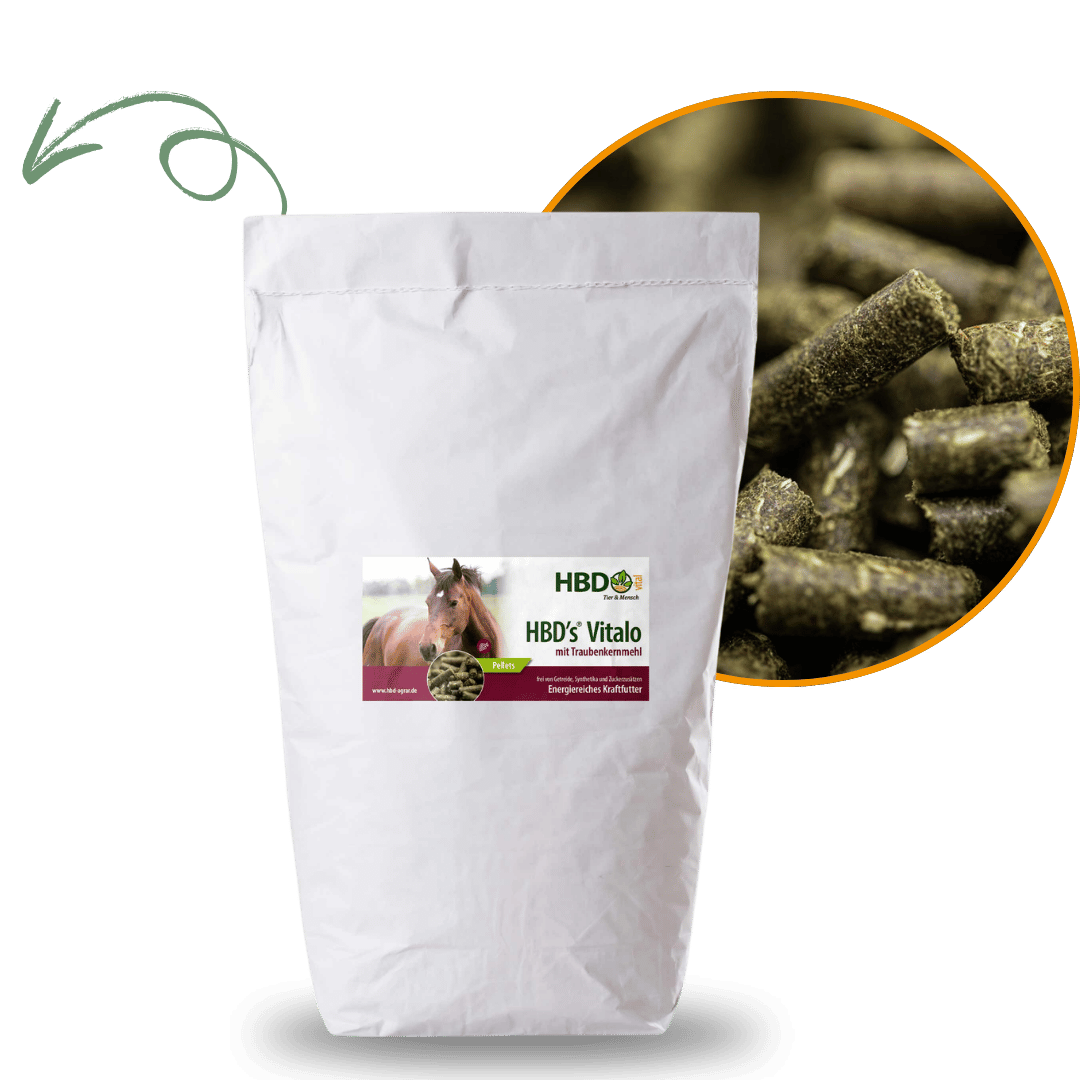 HBD’s® Vitalo TKM kann eine gezielte Eiweißversorgung unterstützen und eignet sich besonders für Pferde mit erhöhtem Bedarf an hochwertigem Protein bei gleichzeitig moderater Energiezufuhr. Das pelletierte Kraftfutter ist auch für stoffwechselempfindliche Pferde geeignet