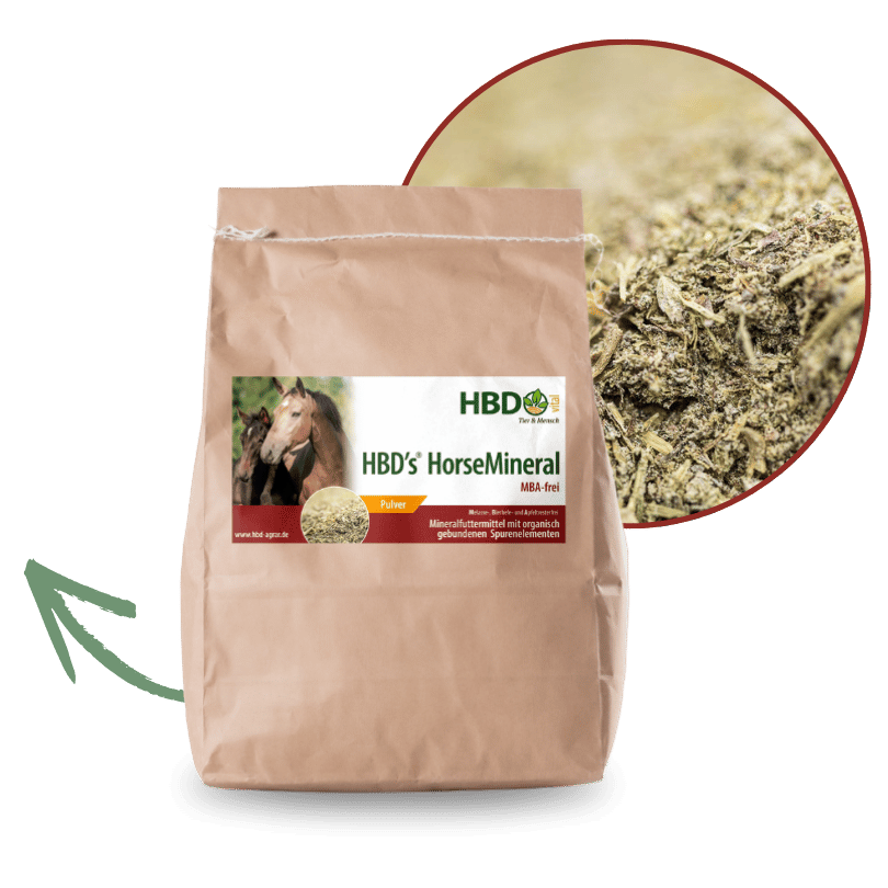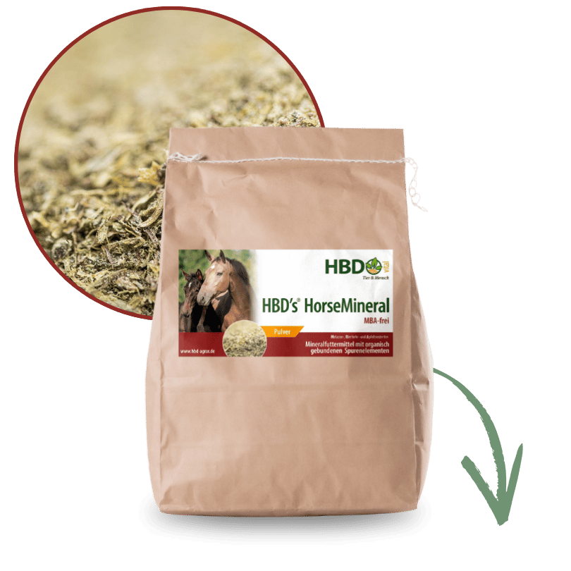 HBD’s® HorseMineral MBA-frei ist speziell für stoffwechselempfindliche & darmkranke Pferde entwickelt. Es versorgt optimal mit organisch gebundenen Spurenelementen – ohne Melasse, Bierhefe oder Apfeltrester..