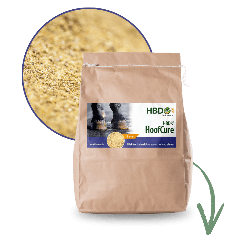 HBD’s® HoofCure unterstützt die Hufe von innen heraus, über die Förderung eines stabilen Darmmikrobioms und die körpereigene Produktion von Biotin. Ideal bei weichen, brüchigen oder langsam wachsenden Hufen.